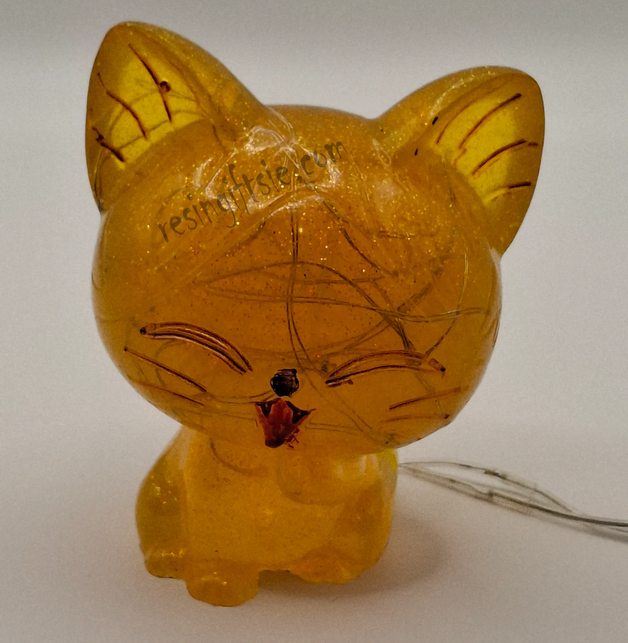 Cat night light. Made from epoxy resin. Comes complete with lights and battery. This cute little cat is the perfect comfort light for your little ones